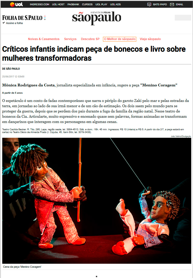 Menino Coragem – nessa história envolvente, um menino (Zaki) e sua irmã (Janaína) se perdem de sua família e vivem uma aventura inusitada, quando passam a enfrentam situações estranhas, perigosas e também divertidas. Para reencontrar seus pais, eles terão que cruzar uma floresta escura com seres surreais, depois um mar de criaturas marinhas fantásticas, até chegarem em uma nova terra. No espetáculo de Teatro Infantil de Bonecos da Cia. Articularte, diversas formas animadas de tamanhos variados ajudam a contar uma curiosa trama com poucas palavras. Conquistou o Prêmio Fomento ao Teatro de São Paulo – 2017, com patrocínio da Secretaria Municipal de Cultura de São Paulo. Também foi indicado a 03 itens do Prêmio S. Paulo de Incentivo ao Teatro Infantil e Jovem (Femsa – Coca Cola 2017). MELHOR TEXTO ORIGINAL; TRILHA MUSICAL ADAPTADA; PRÊMIO SUSTENTABILIDADE.